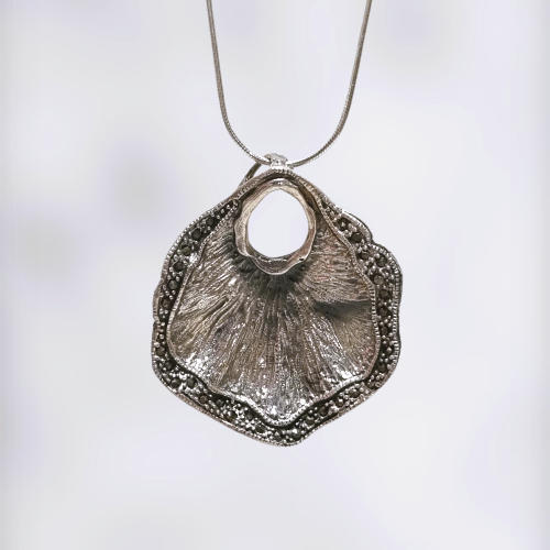 Pingente em formato de Concha com a borda incrustada de Marcassitas, confeccionado em Prata 925 e acabamento envelhecido