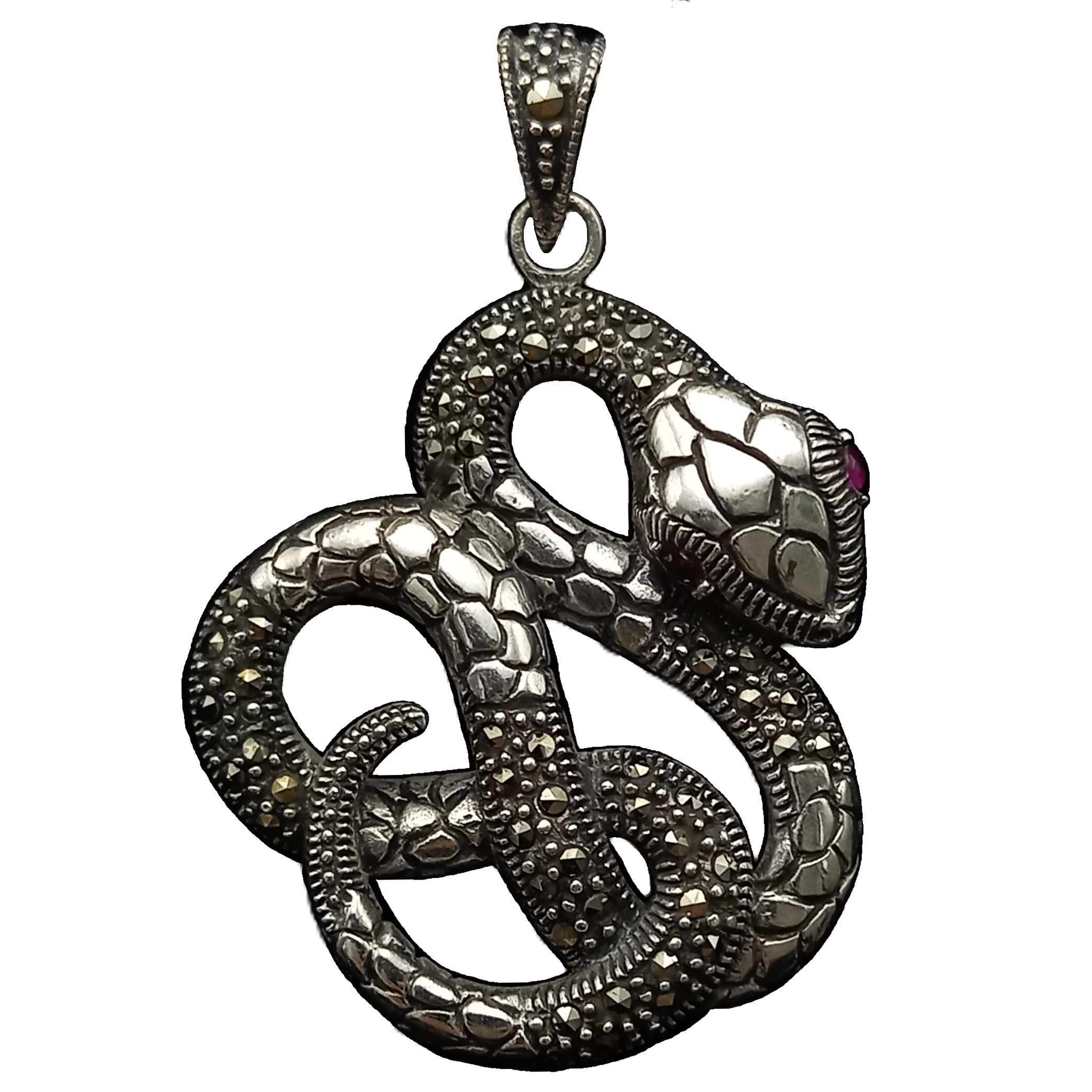 Pingente de Prata 925, cobra trabalhada e cravejada de marcassitas e olhos em pedra natural rubi indiano