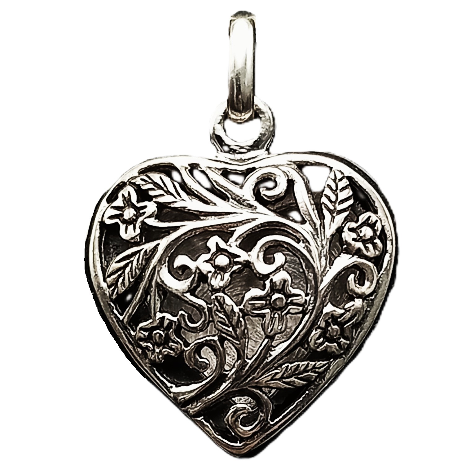 Pingente Relicário Coração, confeccionado em Prata 925, com trabalho vazado em flores e galhos