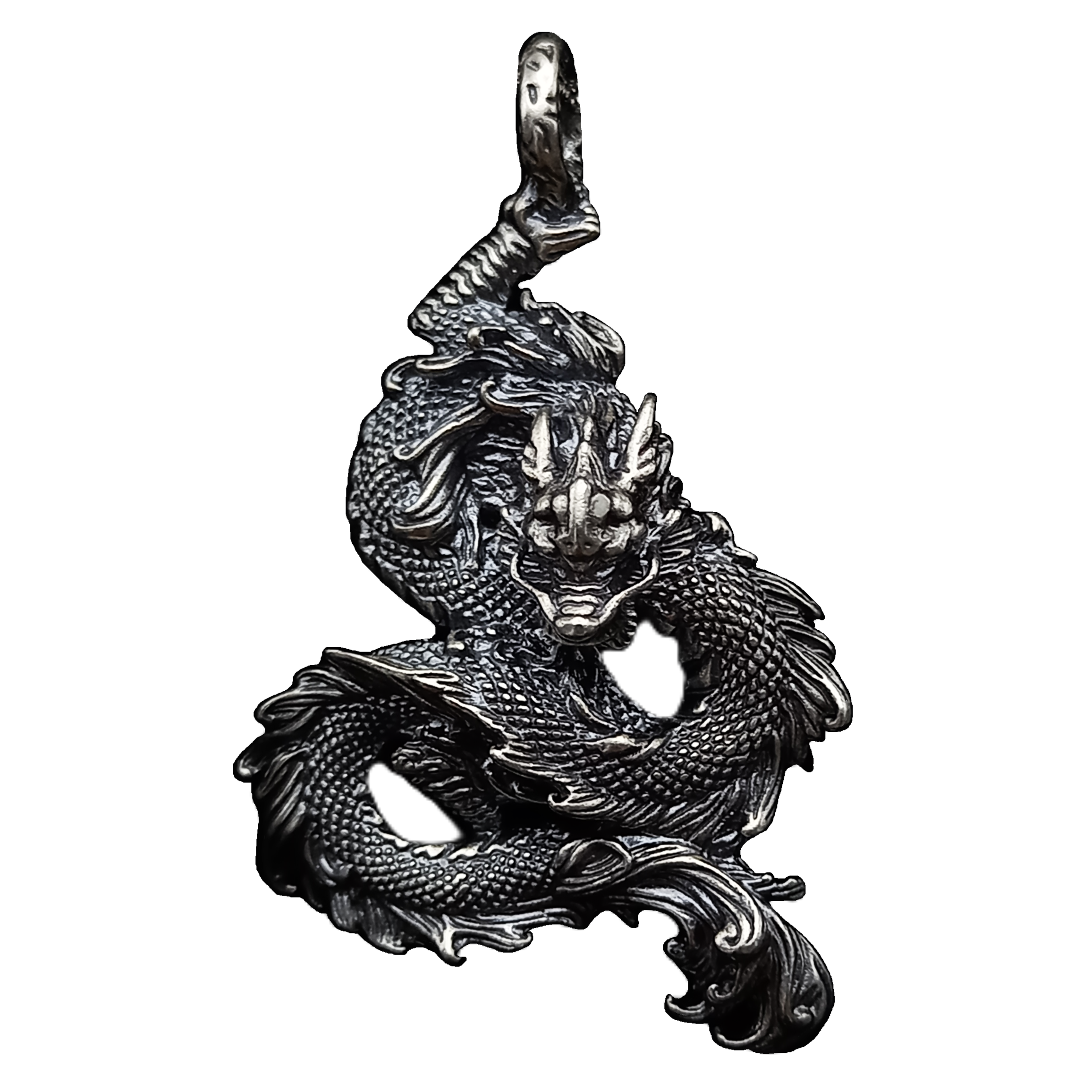 Pingente Dragão confeccionado em Prata 925 maciça (não é imitação em outros metais), com corpo trabalhado em frente, verso e laterais, é inteiriço. Acabamento envelhecido e polido.