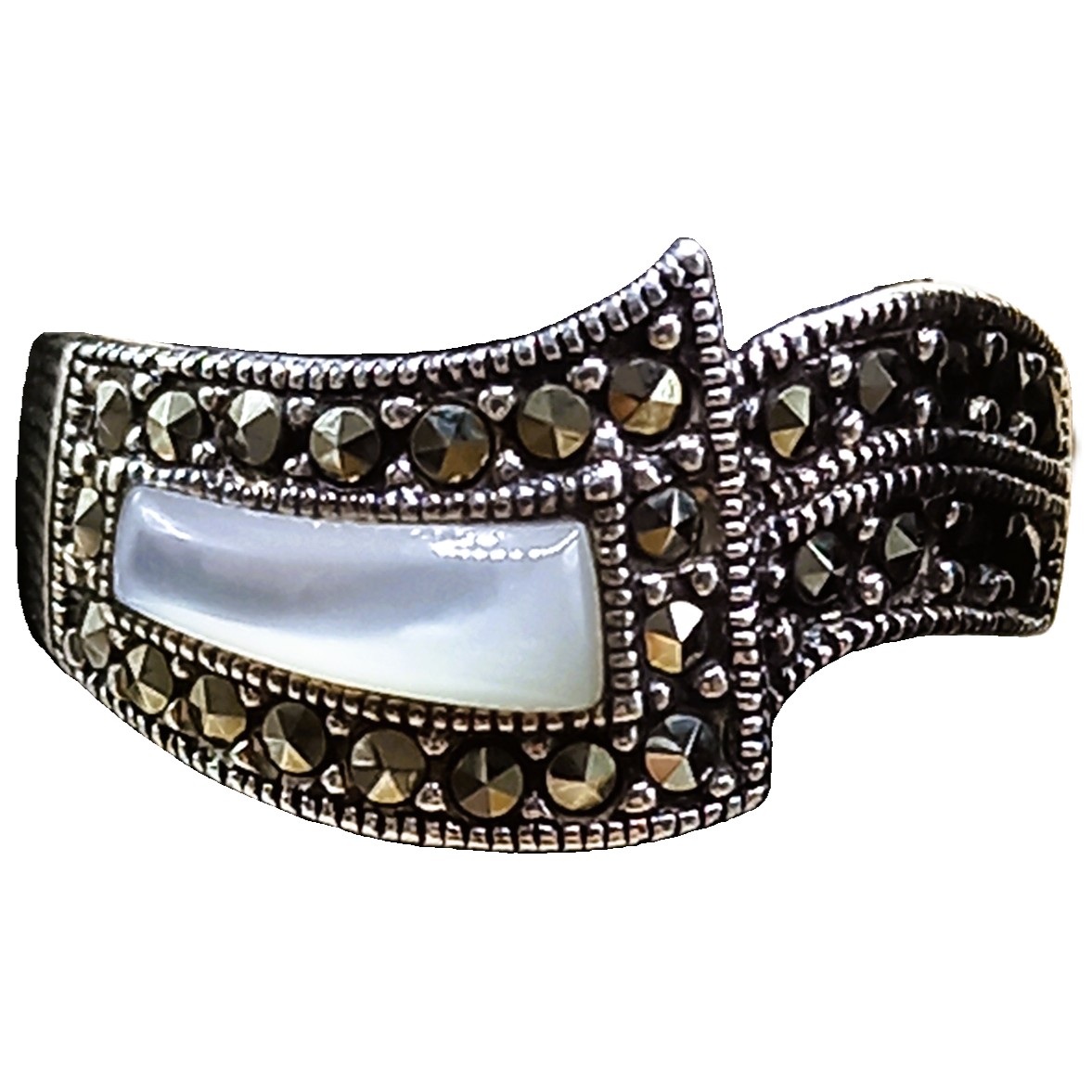 Anel confeccionado em Prata 925, cravejado de marcassitas e Madrepérola
