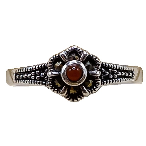 Anel Florzinha confeccionado em Prata 925, cravejado de marcassitas e pedra natural Ágata Vermelha