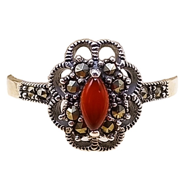 Anel Flor confeccionado em Prata 925, cravejado de marcassitas e pedra natural Ágata Vermelha