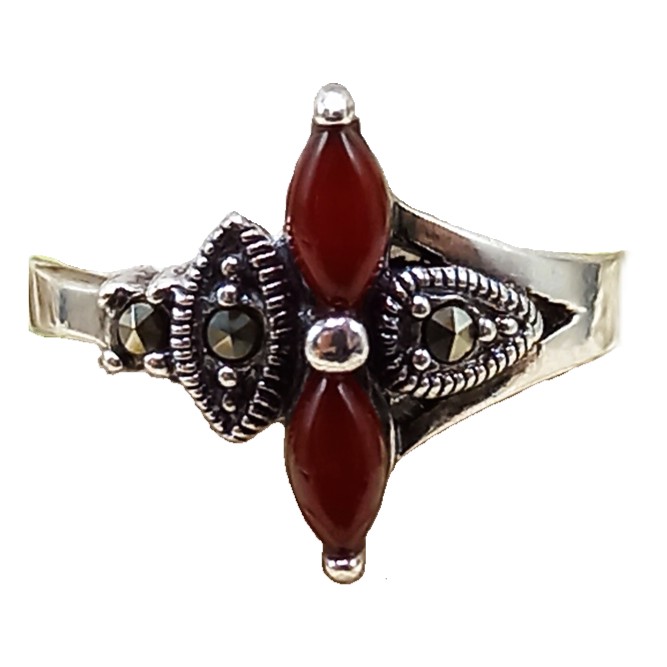 Anel confeccionado em Prata 925, cravejado de marcassitas e pedra natural Ágata Vermelha
