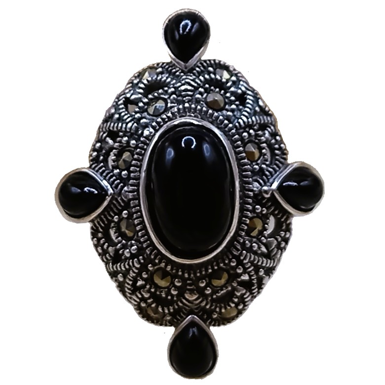 Anel confeccionado em Prata 925, cravejado de marcassitas e detalhes em pedra natural Ônix