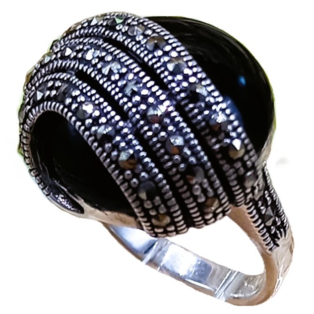 Anel redondo confeccionados em Prata 925, Pedra Ônix Natural e detalhe em sobreposição cravejada de Marcassitas