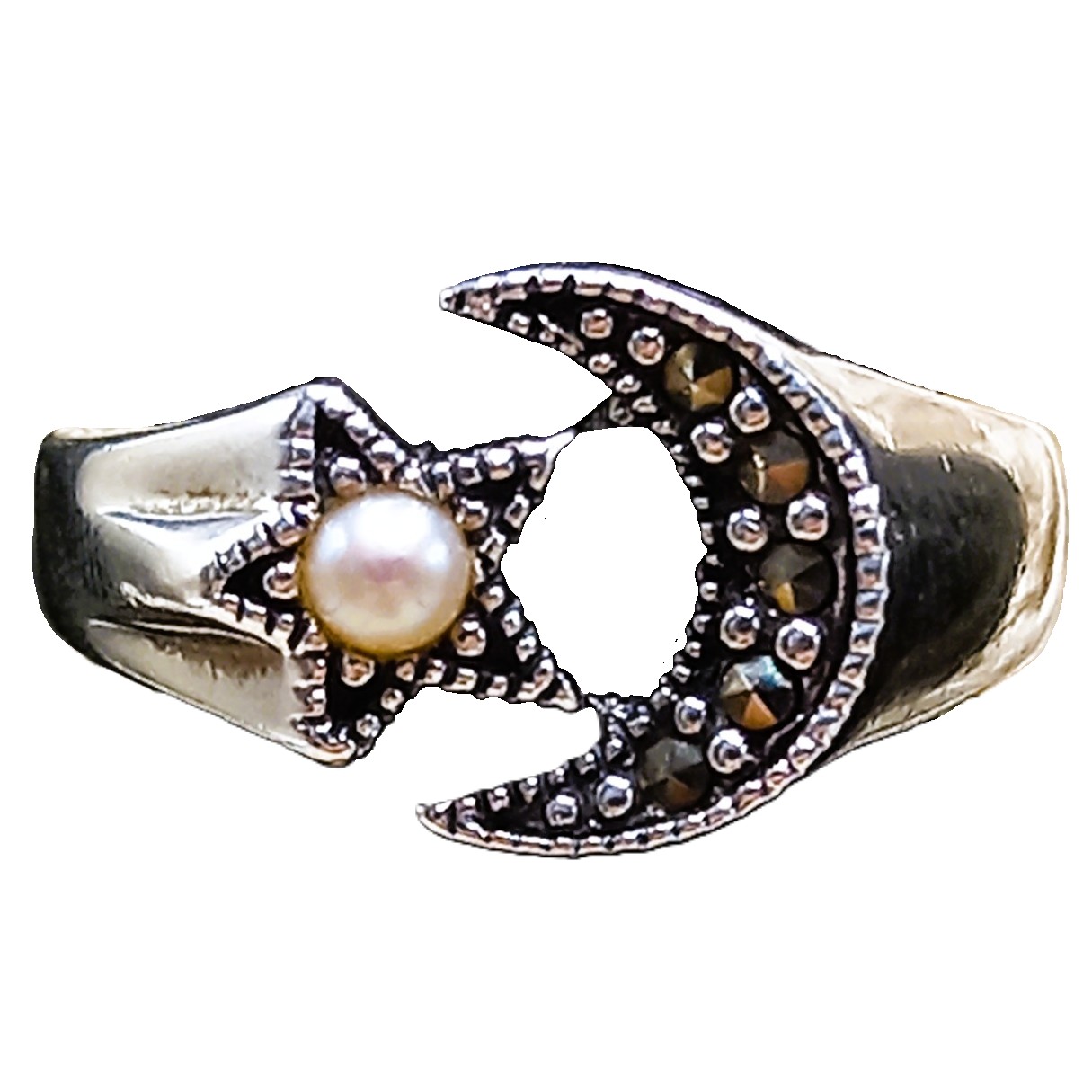 Anel Lua e Estrela confeccionado em Prata 925, cravejado de marcassitas e detalhes em Pérola de Água Doce